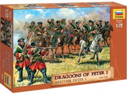 Sada doplňující plastikové modely Zvezda 8072 - figurky dragounů Petra I. Velikého 1701/21 v měřítku 1:72. Stavebnice obsahuje 23 dílků. 10 nenatřených koní. 9 pěších vojáků. Dragoon, major, standardní posel, praporčík a bubeník. ...