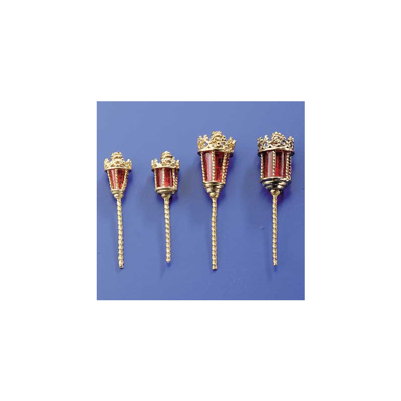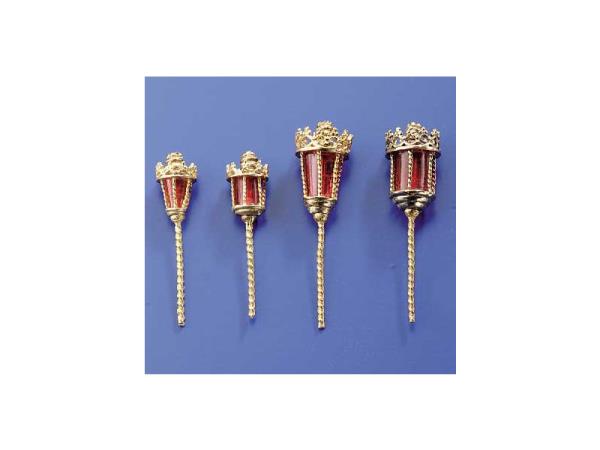 Maketové doplňky pro modely lodí Krick: Replika historické lucerny, lampa kónická, výška lampy 22mm, průměr 12mm, celk. výška 54mm. Kompletně smontována, vložka je vyrobena z průhledného červeného plastu a rám je z kovu ve zlaté barvě. Nelze osvětlit.