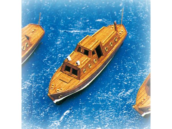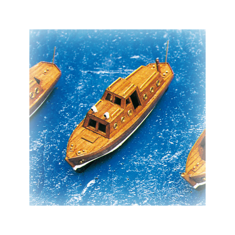 Stavebnice Krick: Motorový kajutový člun kit, rozměry 102x30x35mm. Jednoduchá stavebnice obsahuje přepážky vyřezané laserem z překližky, sadu lišt a stavební plány.