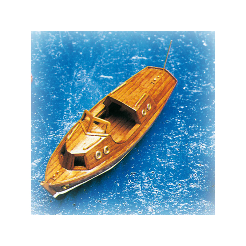 Stavebnice modelu dřevěné lodičky s kormidlem, rozměry 123x35x43mm. Jednoduchá stavebnice obsahuje přepážky vyřezané laserem z překližky, sadu lišt a stavební plány.