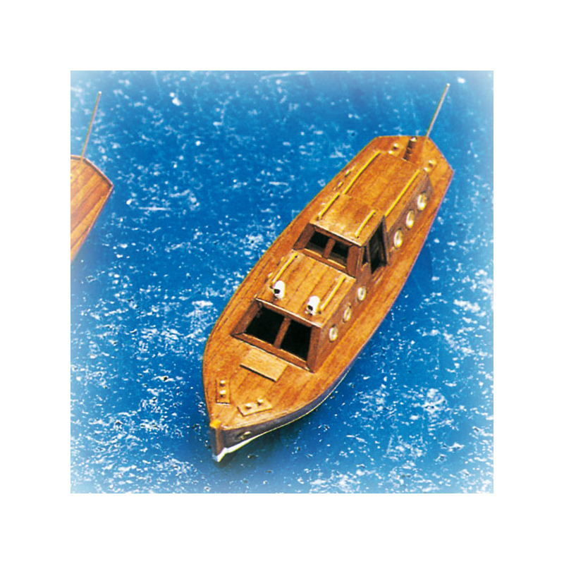 Stavebnice modelu dřevěné lodičky - Motorový kajutový člun, rozměry 125x35x43mm. Jednoduchá stavebnice obsahuje přepážky vyřezané laserem z překližky, sadu lišt a stavební plány.