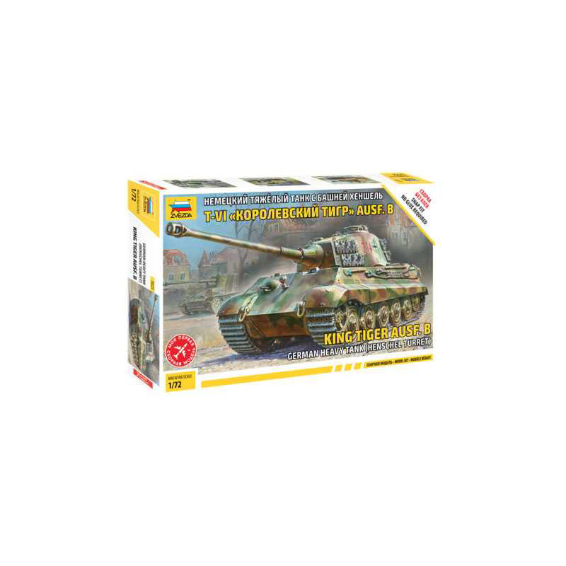 Plastikový model Zvezda 5023 - německý tank E-VIB "Royal Tiger" v měřítku 1:72. Stavebnice obsahuje 83 dílků, délka 143 mm, obtížnost 3.