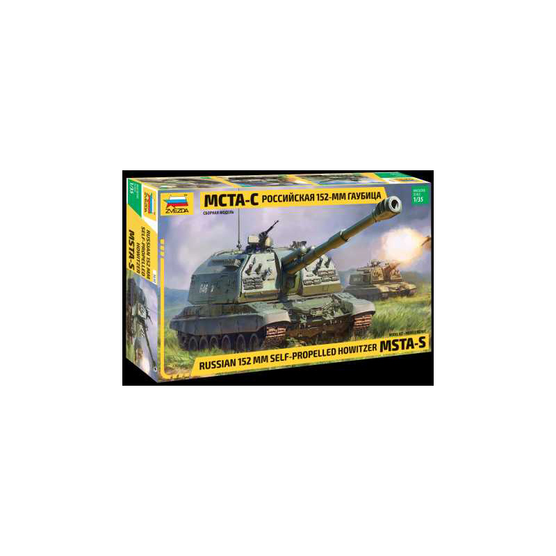 Plastikový model Zvezda 3630 - ruská samohybná dělostřelecká hora 152 mm Msta-S v měřítku 1:35 ke slepení. Stavebnice obsahuje 451 dílků, délka 378 mm.