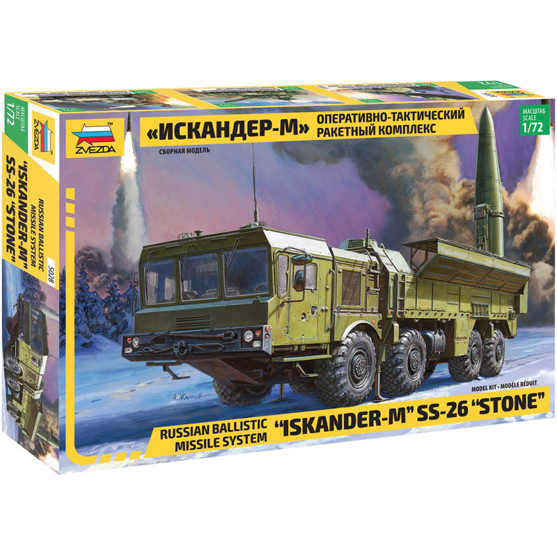 Plastikový model Zvezda 5028 - ruský raketový systém Iskander-M SS-26 Stone v měřítku 1:72. Stavebnice obsahuje 247 dílků, délka 183 mm, obtížnost 3.