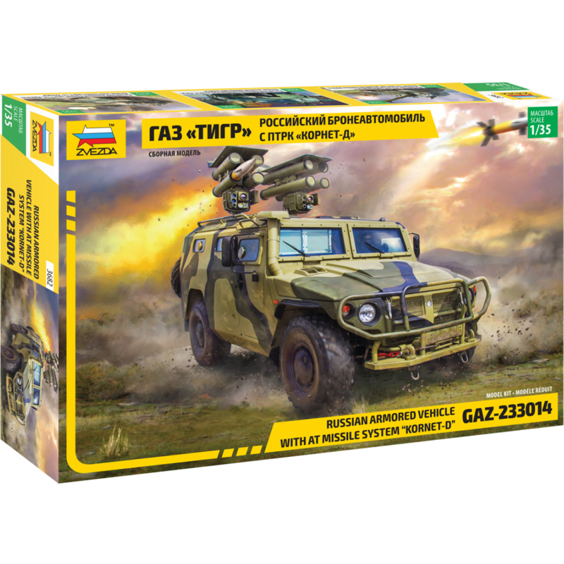 Plastikový model Zvezda 3682 - ruské speciální obrněné vozidlo GAZ 233014 s protitankovým systémem Kornet D v měřítku 1:35 ke slepení. Stavebnice obsahuje 236 dílků, délka 162 mm, obtížnost 3.