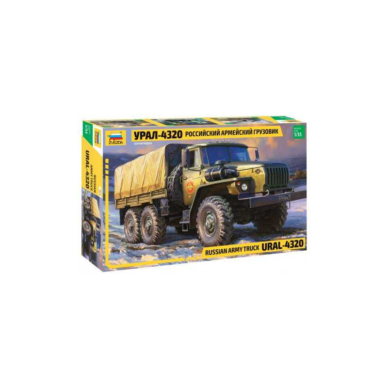 Plastikový model Zvezda 3654 - nákladní automobil ruské armády Ural-4320 v měřítku 1:35 ke slepení. Stavebnice obsahuje 357 dílků, délka 210 mm.