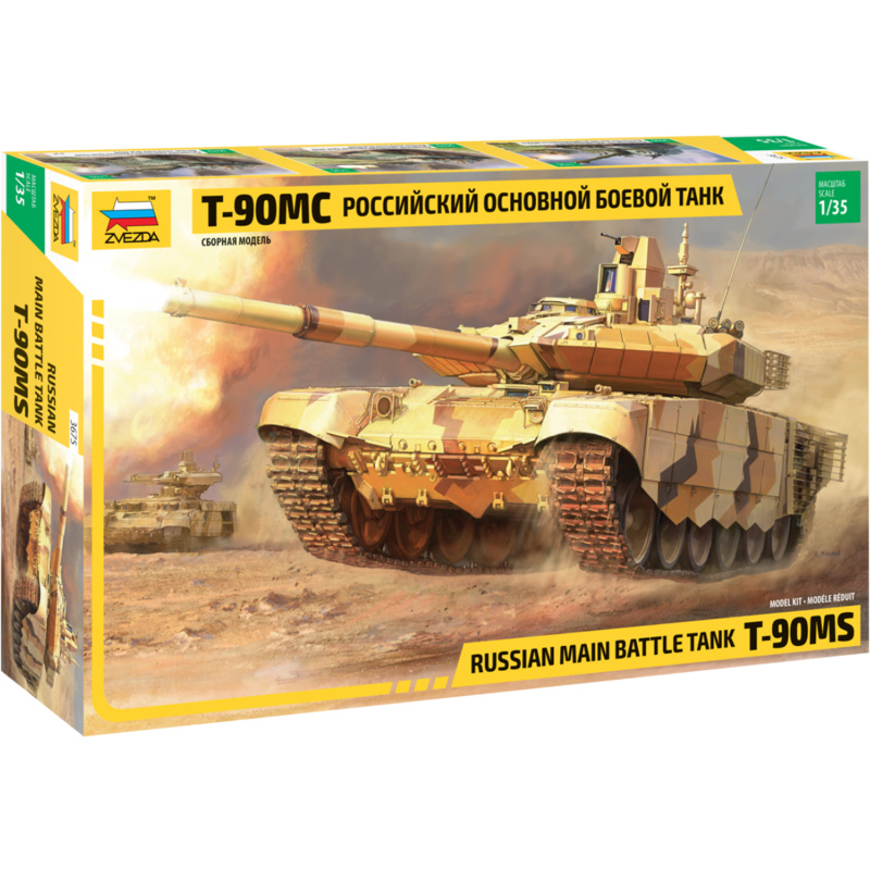 Plastikový model Zvezda 3675 - ruský hlavní bitevní tank T-90MS v měřítku 1:35 ke slepení. Stavebnice obsahuje 459 dílků, délka 270 mm, obtížnost 5.