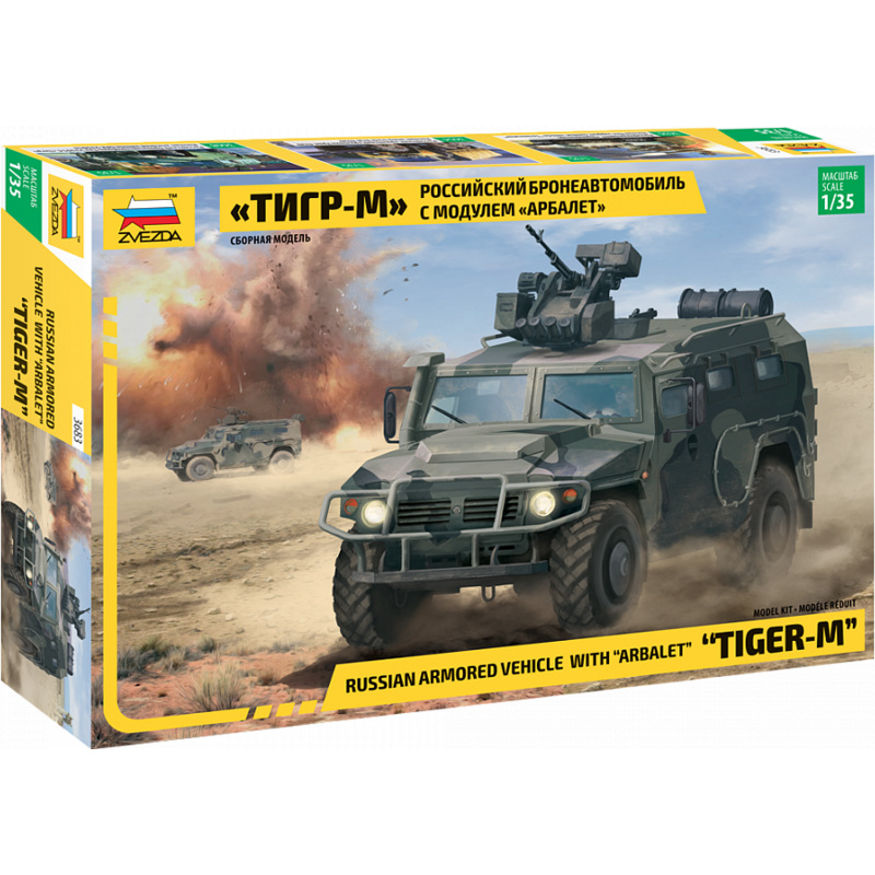 Plastikový model Zvezda 3683 - military GAZ Tiger w/Arbalet v měřítku 1:35 ke slepení. Stavebnice obsahuje 340 dílků, délka 163 mm.