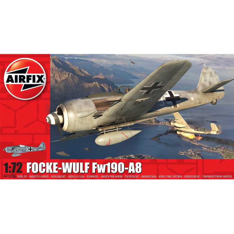 Plastikový model Airfix A01020A - letadlo Focke-Wulf FW190A-8 v měřítku 1:72 ke slepení. Stavebnice obsahuje 53 dílků, rozpětí křídel 145 mm, obtížnost 1.