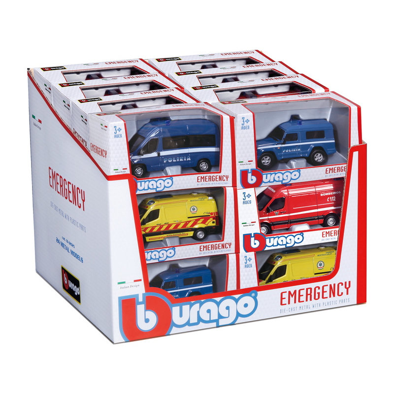 Sada 24 kovových modelů aut 1:50 Bburago Emergency 18-32025 nejen pro sběratele. Dodáváno v display boxu pro vystavení na prodejně. Displej za velmi výhodnou cenu obsahuje náhodný výběr vozů záchranných složek.
