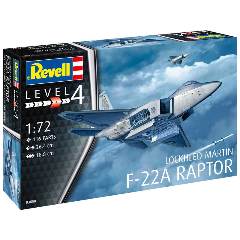 Plastikový model Revell 03858 – letadlo Lockheed Martin F-22A Raptor v měřítku 1:72 ke slepení. Stavebnice obsahuje 116 dílků, rozpětí křídel 188 mm, obtížnost 4.