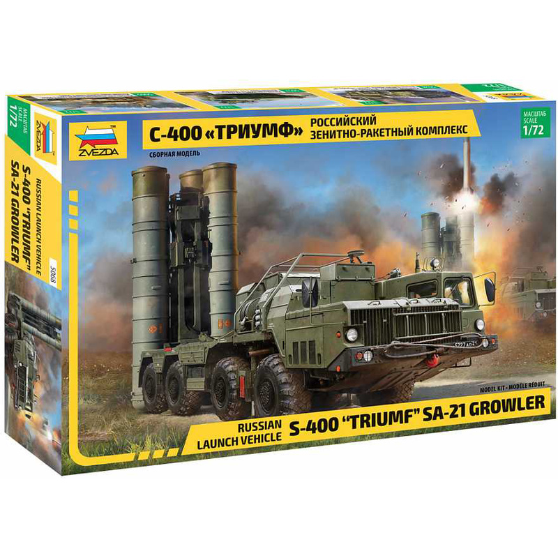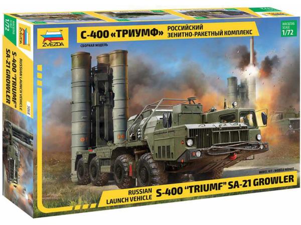 Plastikový model Zvezda 5068 - ruský protiletadlový raketový systém S-400 "Triumph" v měřítku 1:72 ke slepení. Stavebnice obsahuje 283 dílků, délka 186 mm.