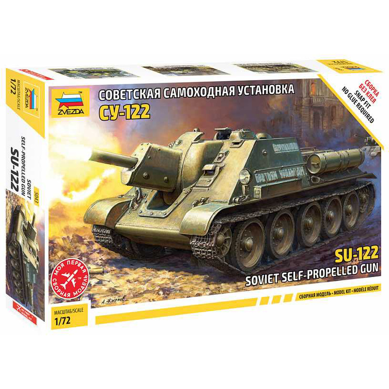 Plastikový model Zvezda 5043 - sovětský samohybný kanón SU-122 v měřítku 1:72. Stavebnice obsahuje 76 dílků, délka 97 mm.