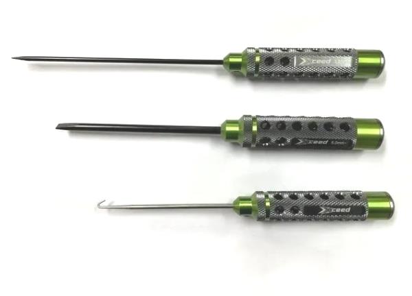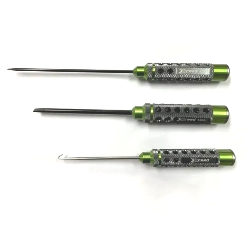 Toto je kombinovaná sada Xceed plochých šroubováků (2 ks.) s novým vzhledem a novým designem a Háčku pro pružiny výfuku nebo pro práci s caster klipy. Díky poutavým 2 barevným tónům (zelená a šedý kov) z eloxovaného dutého hliníkového designu rukojeti a špičkám HSS, které poskytují příjemně vypadající, pohodlný a lehčí pocit. Také díky nim jsou odolnější a zároveň zajišťují dobrou přilnavost k hlavě šroubu.