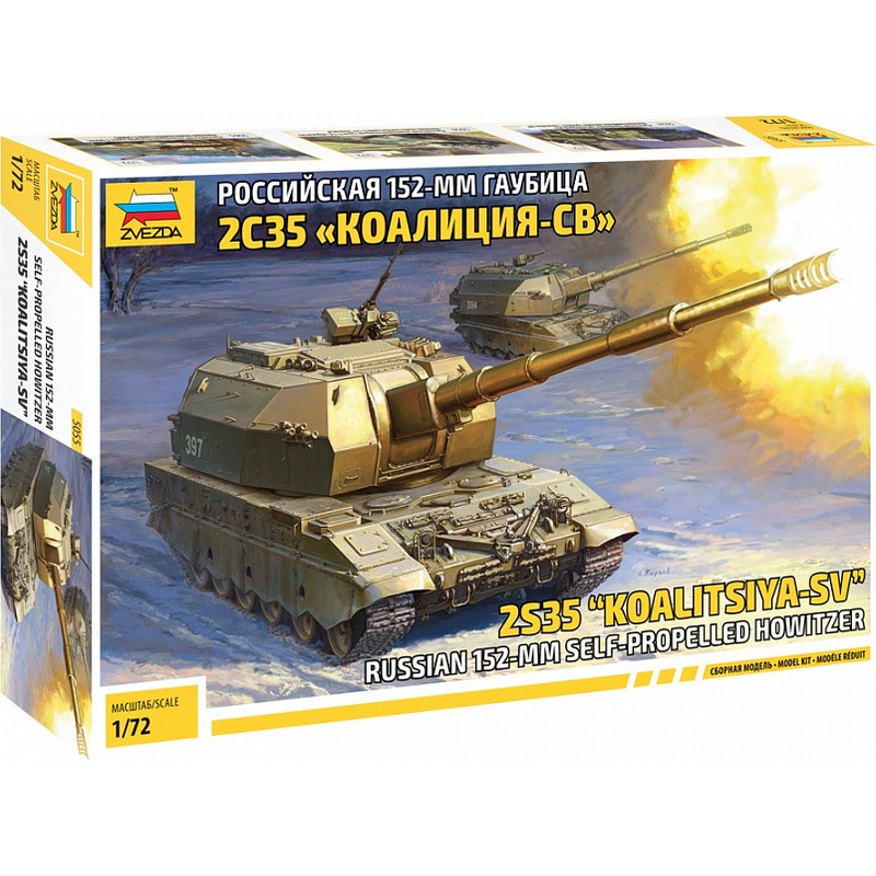 Plastikový model Zvezda 5055 - ruská 152 mm houfnice 2S35 "Coalition-SV" v měřítku 1:72 ke slepení. Stavebnice obsahuje 171 dílků, délka 194 mm.