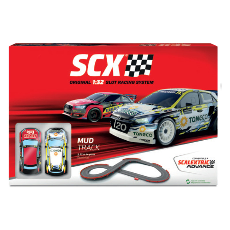 Autodráha SCX Classic Mud Track v klasické měřítku 1:32 - analogová elektrická autodráha s rovinkami, zatáčkami, dlouhým mostem a ochrannými svodidly. Balení obsahuje dva ergonomické ovladače s citlivým ovládáním plynu, dvě detailně zpracovaná dráhová autíčka Audi S1 RX a Hyundai i-20 RX s výbornými jízdními vlastnostmi. Plocha pro rozložení: 184 x 148 cm. Délka tratě: 5,22 m. Složení tratě je velmi snadné, jednotlivé traťové díly zacvaknete do sebe, připojíte ovladače a můžete začít závodit.