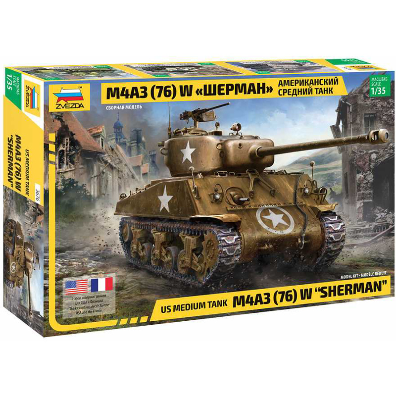 Plastikový model Zvezda 3676 - tank M4 A3 ( 76 mm ) Sherman v měřítku 1:35 ke slepení. Stavebnice obsahuje 322 dílků, délka 168 mm.