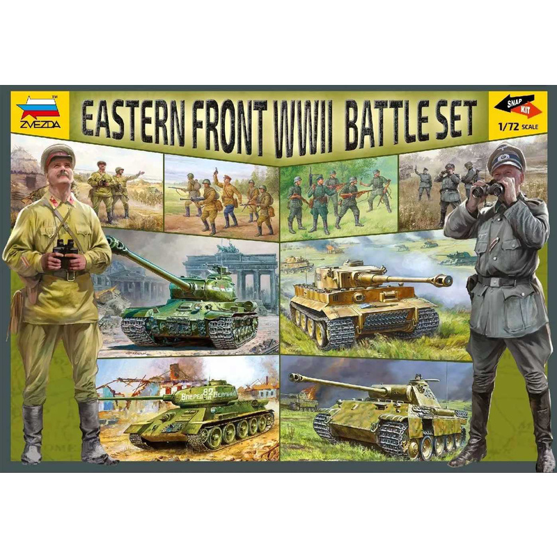 Set plastikových modelů Zvezda 5203 - východní fronta WWII v měřítku 1:72. Stavebnice obsahuje 9 figurek sovětských vojáků, 9 figurek německých vojáků, 2 sovětské tanky a 2 německé tanky. Výška figurky 24 mm.