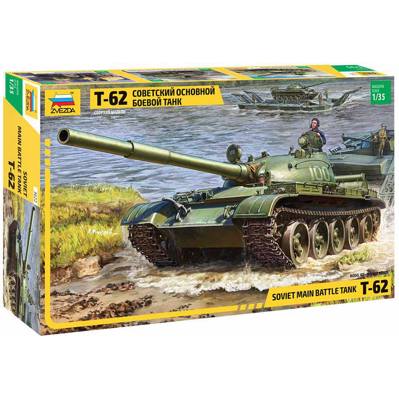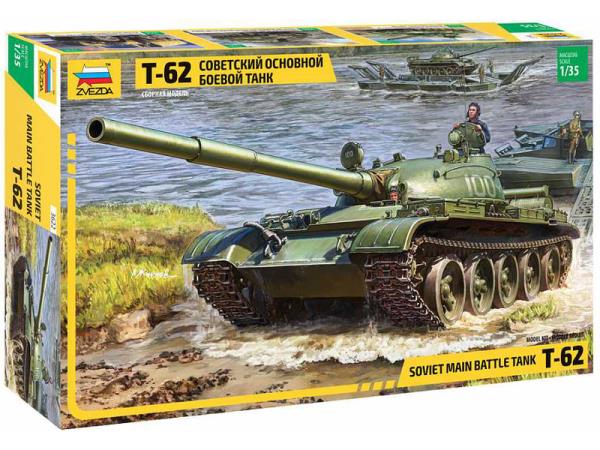 Zvezda plastikový model sovětského tanku T-62 v měřítku 1:35 ke slepení. Stavebnice obsahuje 344 dílků, délka 267 mm.