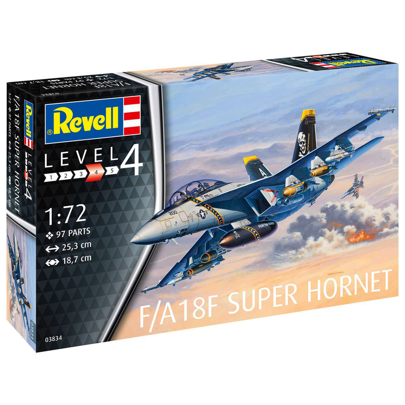 Plastikový model Revell 03834 – Boeing F/A-18F Super Hornet v měřítku 1:72 ke slepení. Stavebnice obsahuje 97 dílků, rozpětí křídel 189 mm, obtížnost 4.