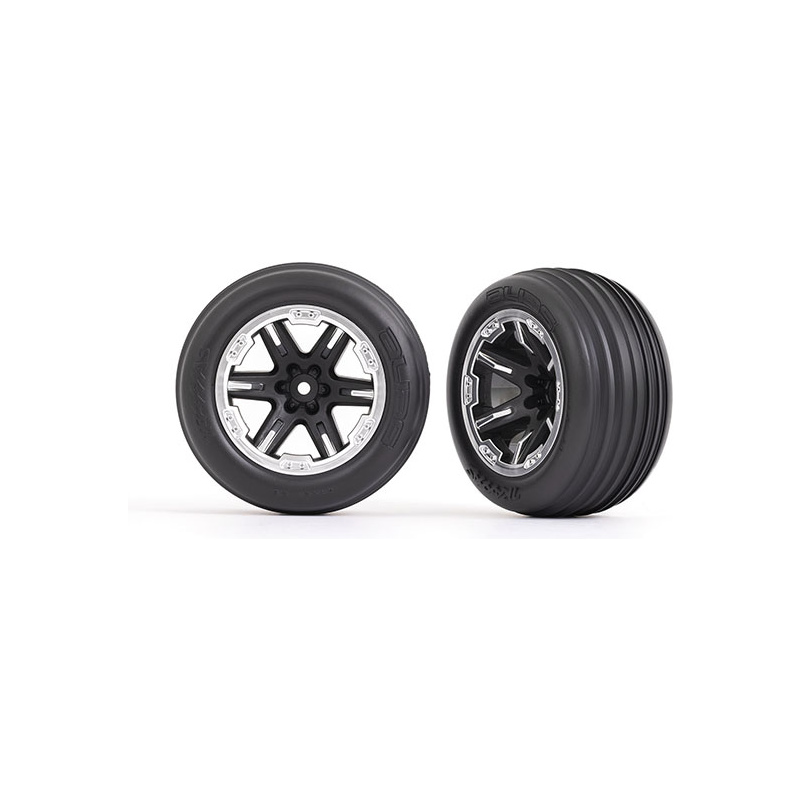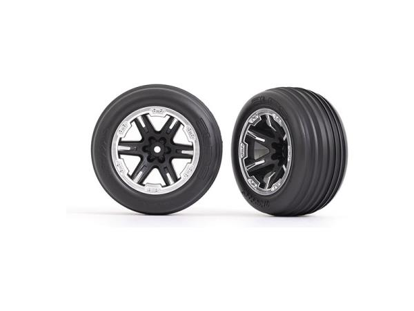 Kompletní přední kola 2.8" RXT pro elektro auta 1:10. Disky černý/polomatný chrom s nalepenými pneumatikami Ribbed a vložkou.