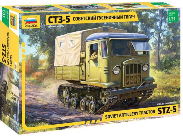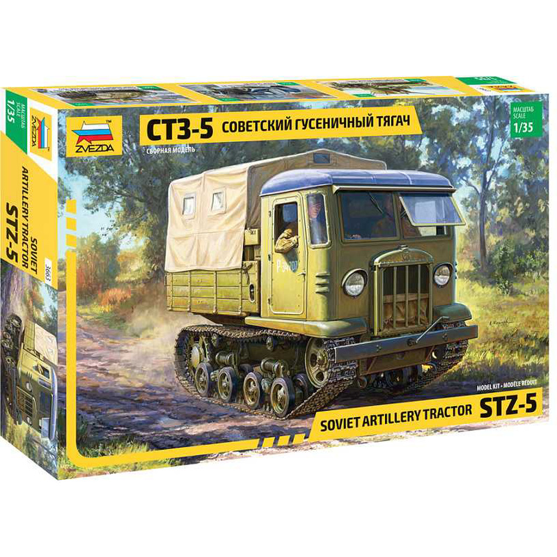 Plastikový model Zvezda 3663 - sovětské pásové auto Stalinec STZ-5 v měřítku 1:35 ke slepení. Stavebnice obsahuje 273 dílků, délka 118 mm, obtížnost 3.