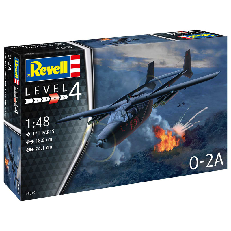 Plastikový model Revell 63819 – letadlo Cessna O-2A Skymaster v měřítku 1:48 ke slepení. Stavebnice obsahuje 171 dílků, rozpětí křídel 241 mm, obtížnost 4.