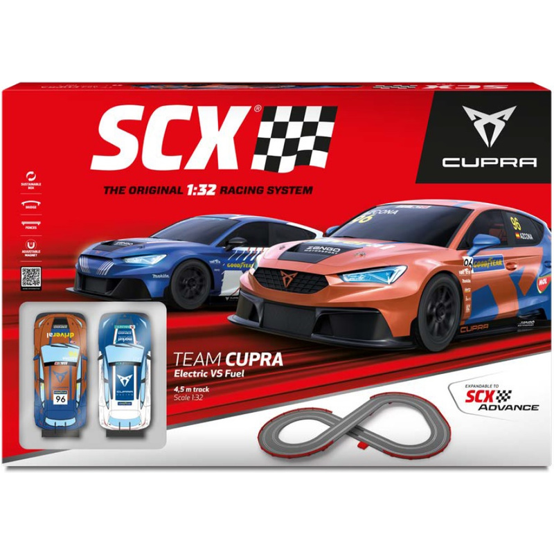 Elektrická autodráha SCX Classic Team Cupra Electric vs Fuel v klasické měřítku 1:32 pro napínavější závody - analogová autodráha ve tvaru osmičky s ochrannými svodidly. Dva ergonomické ovladače, dvě detailně zpracovaná dráhová autíčka Team Cupra. Délka tratě: 4,50 m. Složení tratě je velmi snadné, jednotlivé traťové díly zacvaknete do sebe, připojíte ovladače a můžete začít závodit.