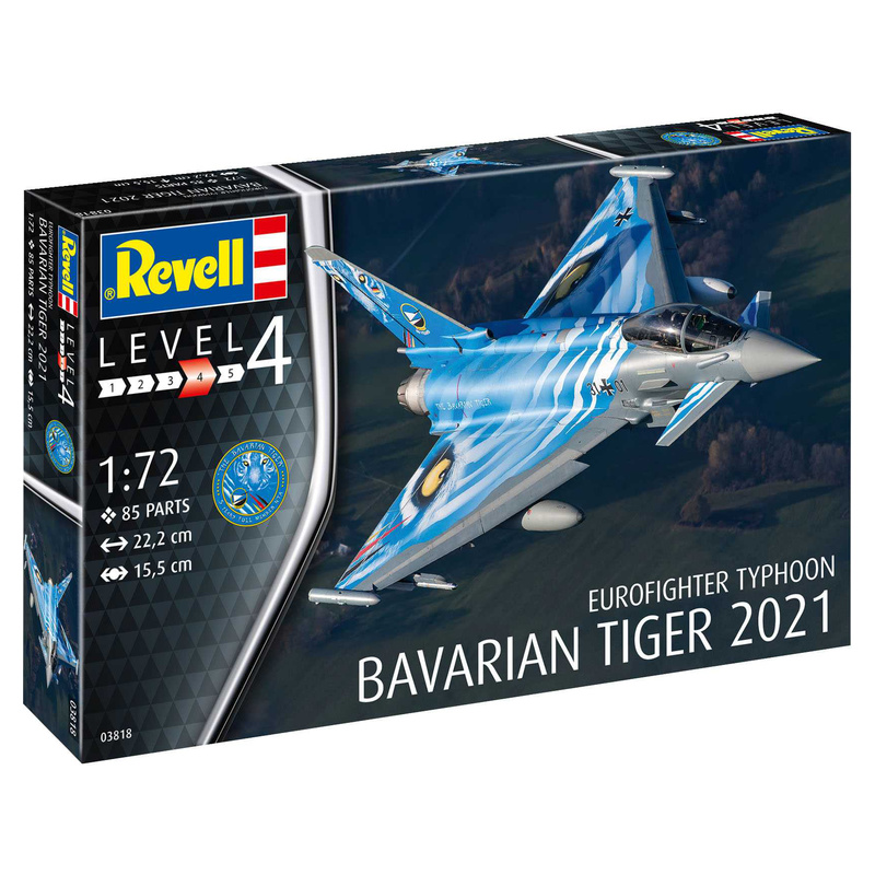 Plastikový model Revell 03818 - letadlo Eurofighter Typhoon Bavarian Tiger 2021 v měřítku 1:72 ke slepení. Stavebnice obsahuje 85 dílků, rozpětí křídel 155 mm, obtížnost 4.