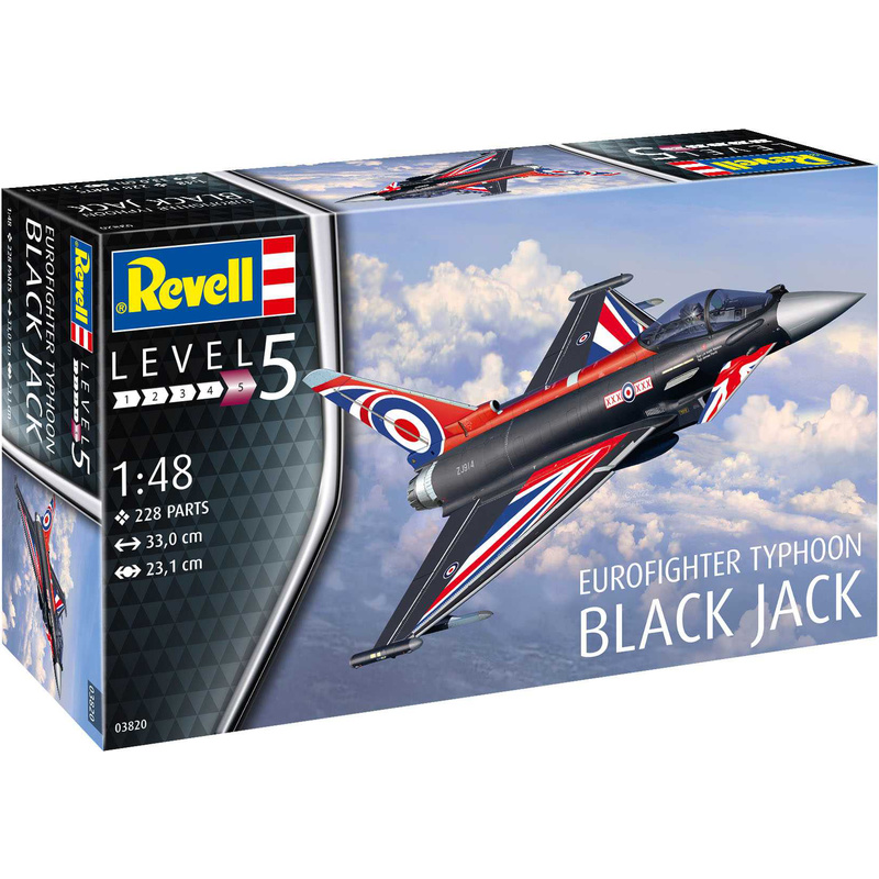 Plastikový model Revell 03820 - letadlo Eurofighter Black Jack v měřítku 1:48 ke slepení. Stavebnice obsahuje 228 dílků, rozpětí křídel 231 mm, obtížnost 5.