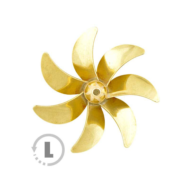 Raboesch lodní šroub tř.185 7-listý, průměr 45mm, směr otáčení levý, montáž na hřídel se závitem M4, materiál mosaz pájená stříbrem.