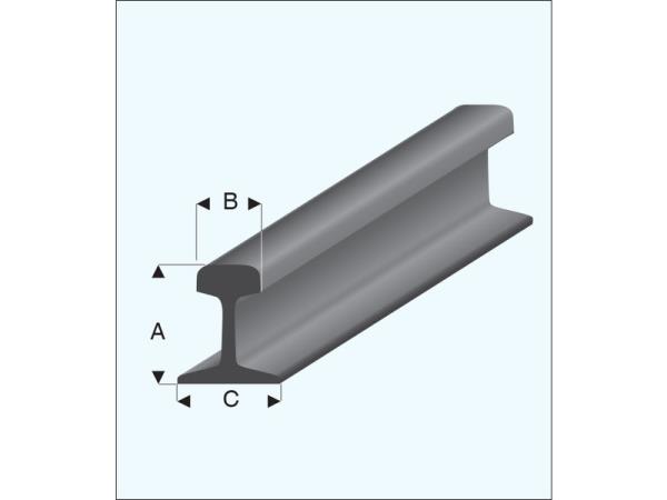 Maketa železničního profilu (kolejnice) z šedého polystyrenového plastu, v měřítku G. Rozměry 8.6 x 3.5 x 7.4 mm (A x B x C), délka 1 m. 5 kusů.
