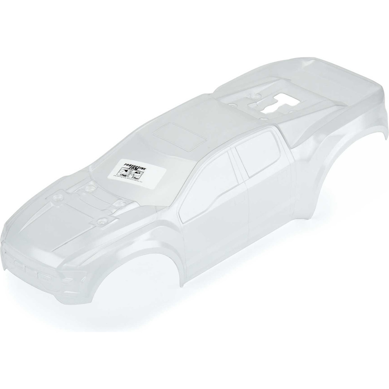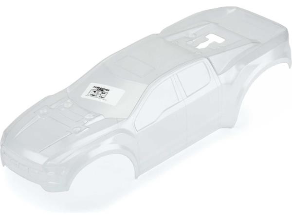 Pro-Line karosérie čirá vyřezaná 2017 Ford F-150 Raptor, pro RC modely aut Rustler 4x4 v měřítku 1:10, rozvor 295mm, délka 422mm, výška 107mm. Vyrobeno z odolného lexanu.