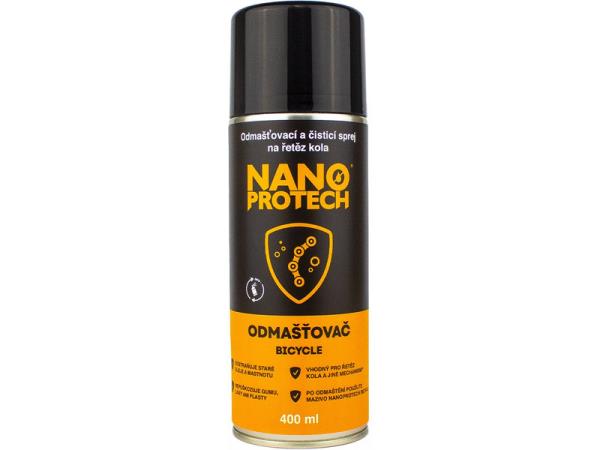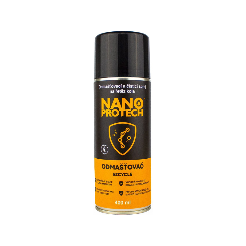 S odmašťovacím sprejem NANOPROTECH Bicycle efektivně a rychle odstraníte veškeré oleje, tuky, zaschlou vazelínu, pasty, mastnotu, chemii a další silná znečištění z kovových a plastových povrchů svého kola. Odmašťovač působí rychle a účinně. Roztok je šetrný ke všem druhům materiálů jako kovy, guma nebo plasty. Snadno se nanáší sprejem a po pár minutách působení můžete rozpuštěné znečištění setřít hadrem či papírovým ubrouskem. K čištění hůře dostupných míst si lze pomoci také štětcem.