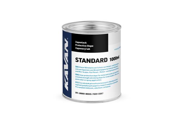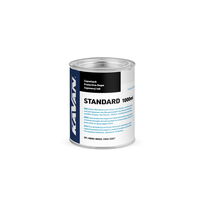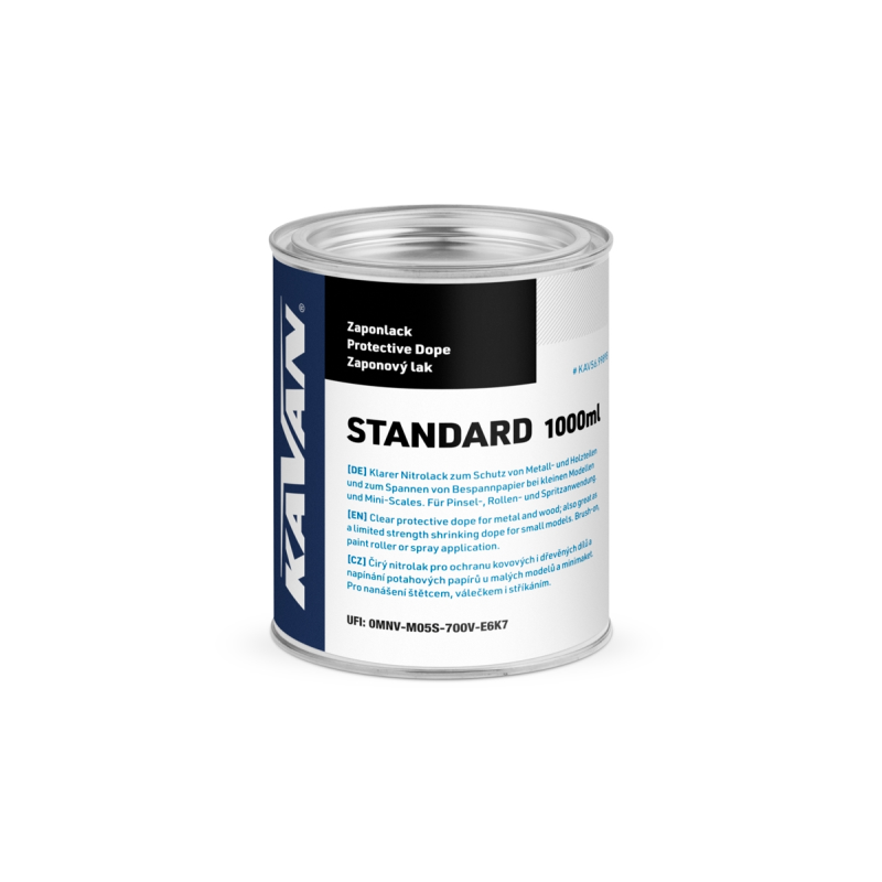 Použití: Lak dle potřeby nařeďte KAVAN Ředidlem STANDARD; na potah nanášejte měkkým plochým štětcem nebo válečkem. Naneste 2–4 vrstvy; nátěr vždy nechejte vyschnout nejméně 24 hodin a přebruste jemným brusným papírem 600–1000. Při použití na modelu se spalovacím motorem je nutno nanést vrchní krycí vrstvu odolnou vůči palivu (např. KAV56.9990 KAVAN krycí lak POLY, 5MA4401 RC Color bezbarvý lak ve spreji).