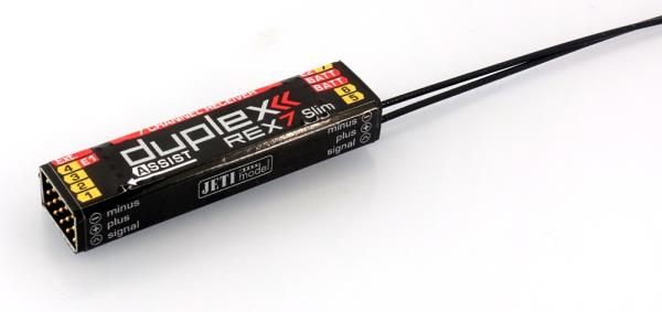 7-mi kanálový štíhlý přijímač se stabilizací pro montáž do úzkých trupů modelů F3J, F5J atd. Kompaktní rozměry s možností rozšíření funkce stabilizačního systému ASSIST o vario a výškoměr z něj dělá jeden z nejoblíbenějších typů. Přijímač má dva uživatelsky nastavitelné výstupy E1 a E2 možnostmi nastavení pro servo, JETIBOX/Senzor EX, PPM výstup, PPM vstup, EX Bus výstup, UDI výstup, S.BUS a samostatný napájecí vstup. Integrovaný systém ASSIST je vyspělý stabilizační systém s širokou možností uživatelského nastavení pro modely letadel a koptér.