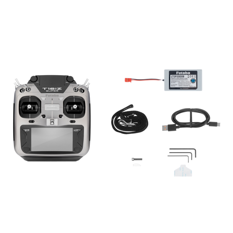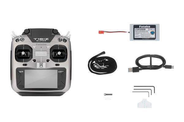 Vysílač T16IZ SUPER ve skříňce dokonale padnoucí do ruky je vybaven přesnými křížovými ovladači s nastavitelnou aretací/neutralizací, 8 přepínači, 2 posuvnými ovladači, 4 digitálními trimy a 2 otočnými proporcionálními ovladači. K programování slouží dvojice tlačítek a velký podsvícený barevný dotykový LCD displej zajišťující snadnou orientaci v intuitivním menu. T16IZ SUPER má paměť pro 30 modelů neomezeně rozšiřitelnou pomocí mikroSD karty a širokou škálu pokročilých mixových funkcí pro akrobatická letadla, větroně, vrtulníky a multikoptéry. Kromě zobrazení telemetrických dat na displeji je k dispozici hlasový výstup telemetrie v zásuvce pro sluchátko (není součástí soupravy). T16IZ SUPER je rovněž vybaven zásuvkou učitel-žák a zásuvkou pro programování a nastavování S.BUS serv a gyroskopických systémů CGY755/CGY760R nebo GYA553. USB datová zásuvka na horní straně vysílače možňuje používat T16IZ SUPER po připojení k PC USB kabelem jako ovladač pro RC simulátor bez potřeby dodatečného USB rozhraní.