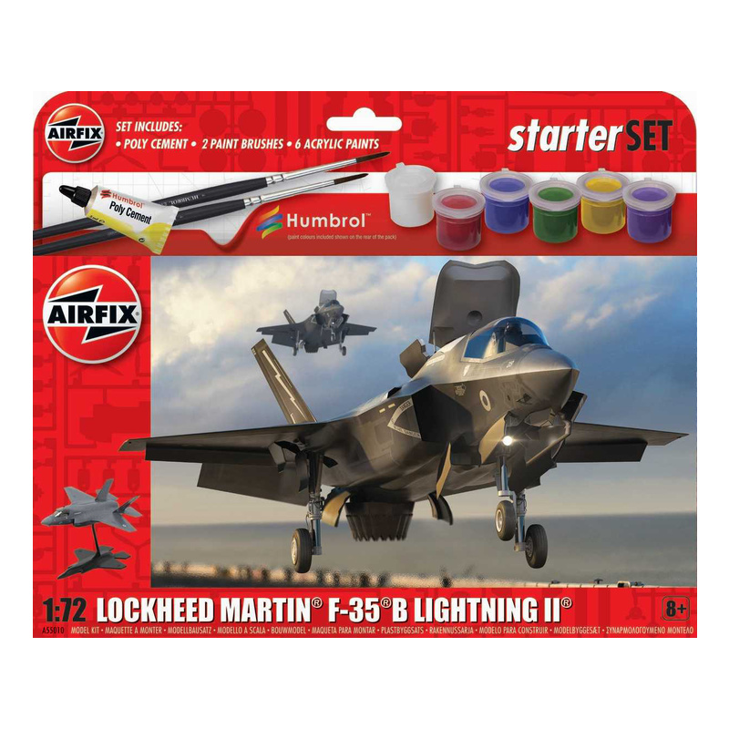 Plastikový model Airfix A55010 - letadlo Lockheed Martin F-35B Lightning II v měřítku 1:72 ke slepení. Stavebnice obsahuje 42 dílků, lepidlo, štětec, barvičky, rozpětí křídel 152 mm, obtížnost 1.