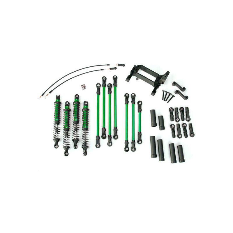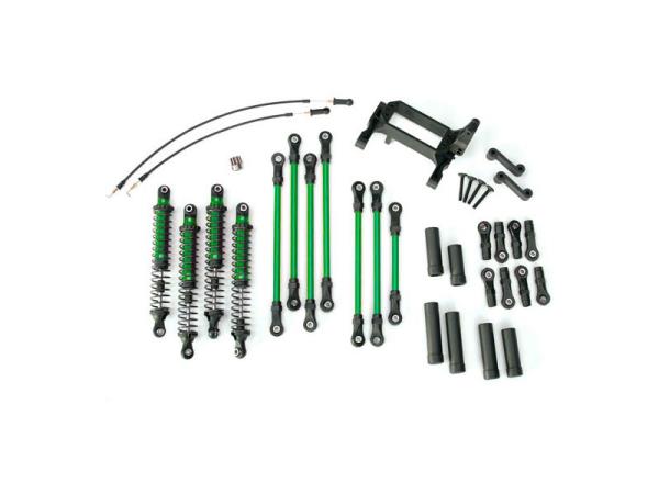 Tuningová konverzní sada v zelené barvě pro podvozek Traxxas TRX-4 umožňující vyšší zdvih kol. Sada obsahuje veškeré potřební díly potřebné k přestavbě.