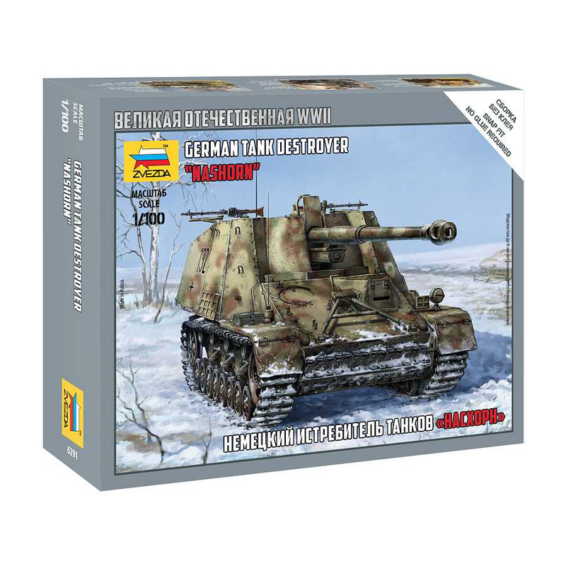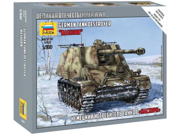 Zvezda plastikový model samohybného děla Sd.Kfz.164 Nashorn v měřítku 1:100. Stavebnice obsahuje 30 dílků, délka 111 mm, obtížnost 1.