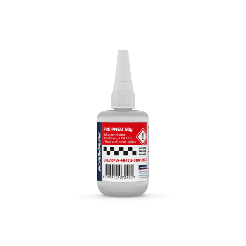 Špičkové řídké vteřinové (kyanoakrylátové) lepidlo s vysokou pevností pro modelářské i všeobecné použití speciálně optimalizované pro lepení pneumatik RC aut. Dodává se v lahvičce s aplikačním nástavcem odolným proti ucpání. 50g balení je zvláště výhodné pro závodní piloty s velkou spotřebou lepidla.