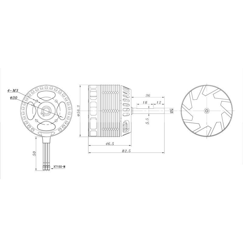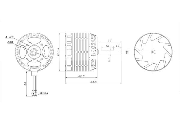 Montáž motoru: Sunnysky M4520R 1120KV je konstruován pro přední montáž. Upevňovací otvory se závitem M4 jsou umístěny na čele motoru na kružnici o průměru 30 mm. Délka volné hřídele je 36 mm; v případě potřeby je možno hřídel vyměnit za dlouhou tuningovou (55 mm).