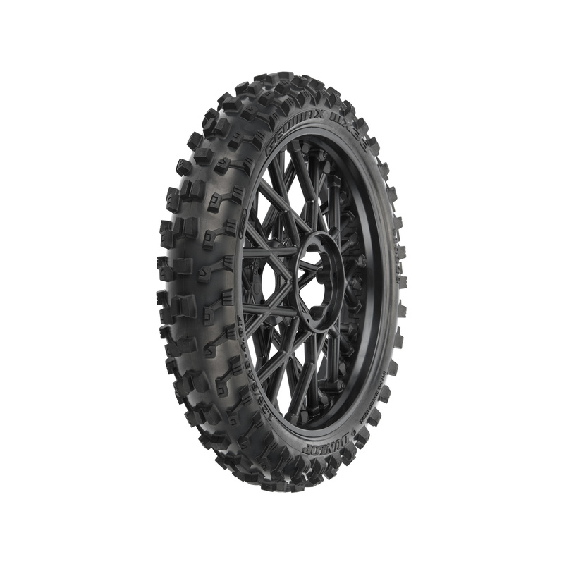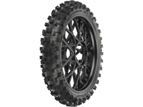 Pneumatika Dunlop Geomax MX33 je namontována na černém ráfku Bullyspoke V2 Bead společnosti Pro-Line, které má výhody z hlediska odolnosti i estetiky. Tloušťka paprsků byla zvýšena, aby se zabránilo ohýbání při tvrdých nárazech. Patky paprsků jsou na ráfku u středu kola, který odpovídá skutečnému motokrosu. Uvnitř pneumatiky je vysoce kvalitní, odolná vložka s uzavřenými buňkami.