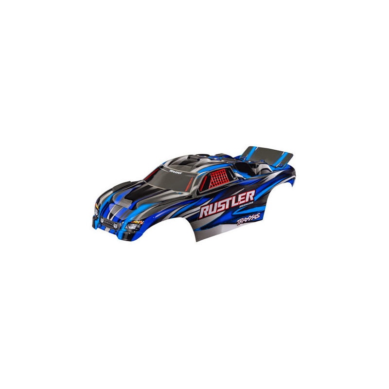 Traxxas karosérie Rustler modrá (bezsponková), hotová nabarvená, aplikované obtisky. Vhoná i pro Rustler VXL. Včetně předního a zadního bezsponkového držáku karoserie.