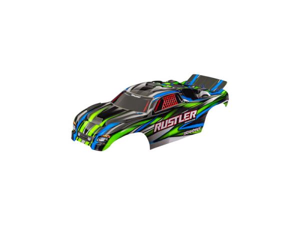 Traxxas karosérie Rustler zelená (bezsponková), hotová nabarvená, aplikované obtisky. Vhoná i pro Rustler VXL. Včetně předního a zadního bezsponkového držáku karoserie.