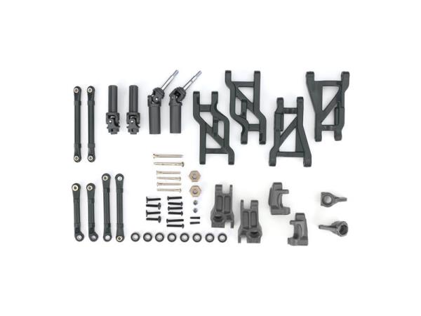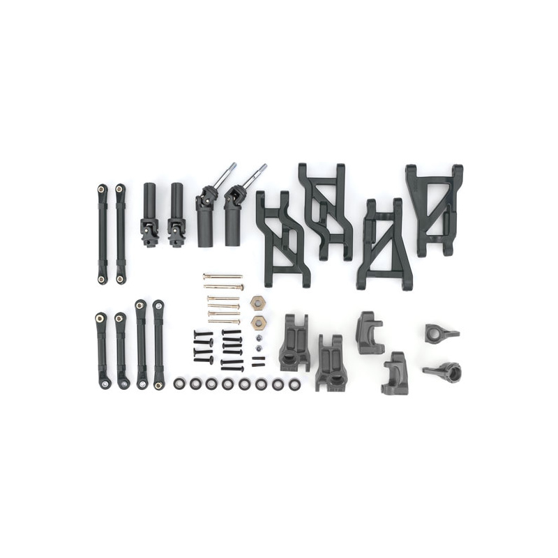 Balení obsahuje těhlice, držáky těhlic, ramena, táhla, poloosy, ložiska, unašeče a montážní příslušenství. Manuál EN, DE, FR, SP.