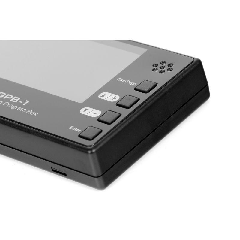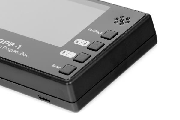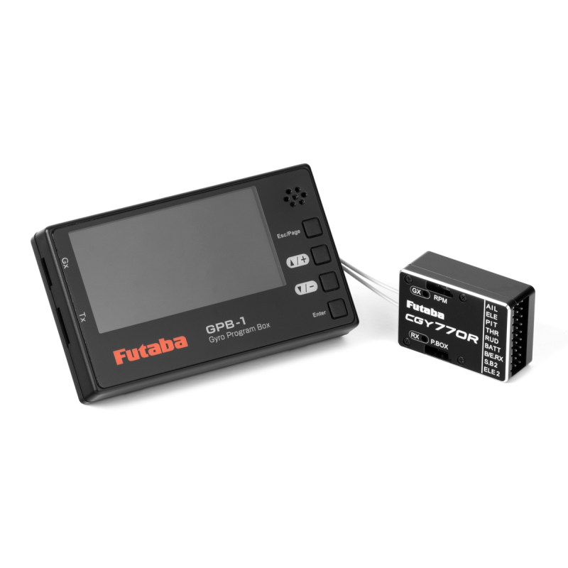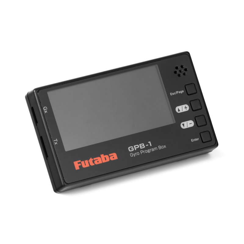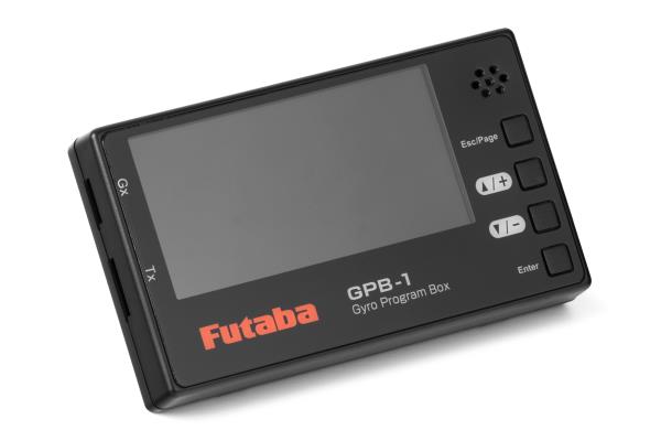 Inteligentní programátor s grafickým LCD displejem (128x64 bodů) pro nastavování gyroskopických systémů Futaba CGY 770R, CGY760R, CGY755 pro vrtulníky a GYA553 pro letadla. Nastavování je možné s přímým kabelovým připojením ke gyru (nastavení celého rozsahu parametrů) nebo bezdrátově pomocí systému učitel-žák při připojení ke kompatibilnímu vysílači Futaba (omezený rozsah parametrů). GPB-1 umožňuje rovněž nastavování S.BUS/S.BUS2 serv Futaba.
