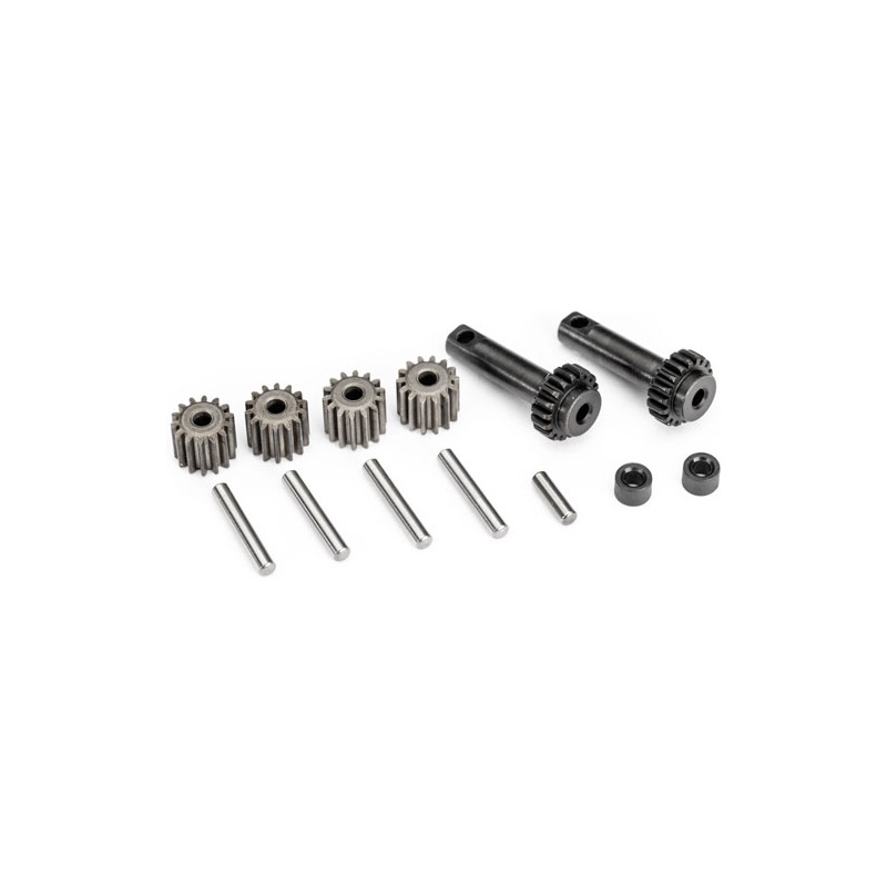 Náhradní díl pro RC modely aut Traxxas 1:12 Mini: planetová kola diferenciálu. Obsahuje výstupní převody (2), výstupní hřídel převodů (1), planetové převody (4), hřídele planetový převodů (4), vymezovače (2).