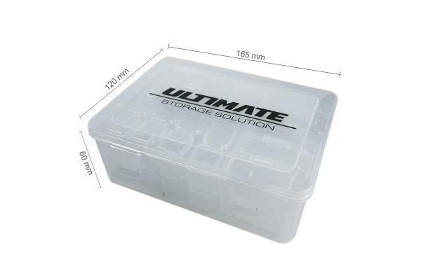 Pevný, odolný, průsvitný box o rozměrech 165x120x60 mm obsahuje 5 vnitřních boxů o rozměrech 55x55x20 mm a 32 boxů o rozměrech 24x20x24 mm se samostatným uzamykatelným víkem pro rychlé a snadné uložení dílů.