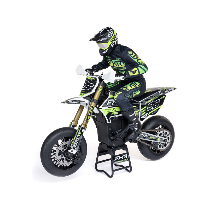 Motorka na dálkové ovládání Promoto-SM vypadá jako skutečný motard. Mezi výrazné maketové detaily patří chrániče rukou, zkrácený přední blatník a oficiálně licencovaná grafika FXR s oblečením jezdce. Maketový vzhled se skloubí s technicky výborně zvládnutým realistickým ovládáním motorky a s vysokým výkonem střídavého motoru. To vše díky jedinečnému spojení mechanické a elektronické technologie, vyvinuté speciálně pro Losi Promoto.